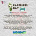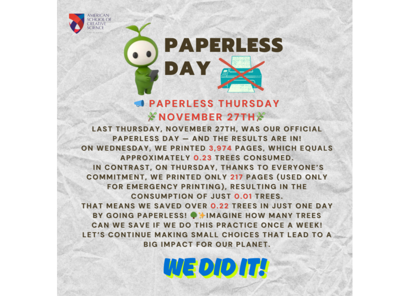 Thursday, November 27th, 2025, was our official Paperless Day — and the results are in! On Wednesday, we printed 3,974 pages, which equals approximately 0.23 trees consumed. In contrast, on Thursday, thanks to everyone’s commitment, we printed only 217 pages (used only for emergency printing), resulting in the consumption of just 0.01 trees. That means we saved over 0.22 trees in just one day by going paperless! 🌳✨Imagine how many trees can we save if we do this practice once a week! Let’s continue making small choices that lead to a big impact for our planet.